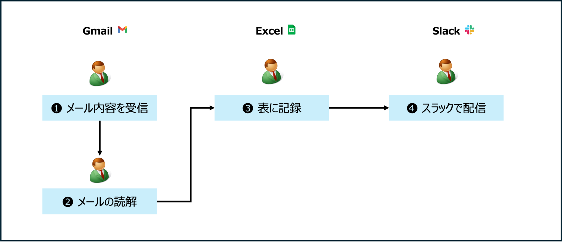 ノードとは、n8nにおける1つの業務ステップを表す「箱」です。たとえば、日々のメール業務を例にすると、次のような作業があります。