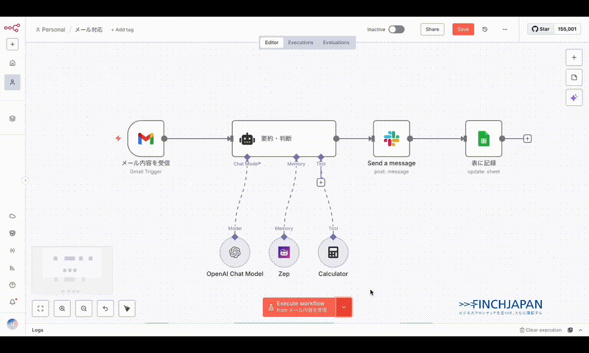特に「メールの内容を判断し、整理する」工程は、ChatGPTなどのAIノードに置き換えることができます。